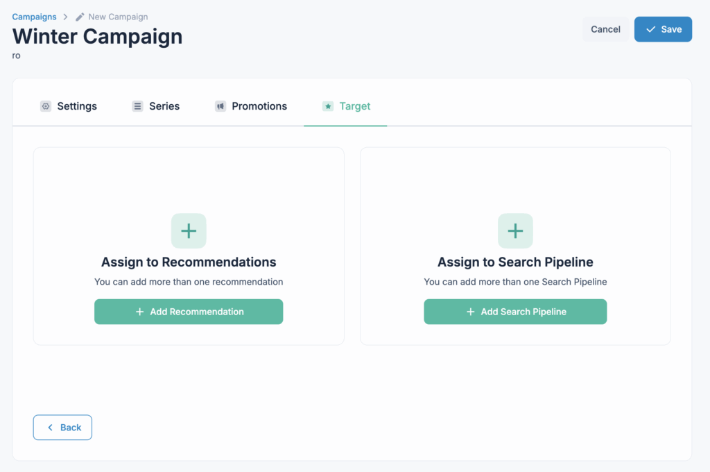 4. Assign created campaign to an already existing Recommendation or Assign to Search Pipeline, depends on your Marketing strategies and where you want more engagement