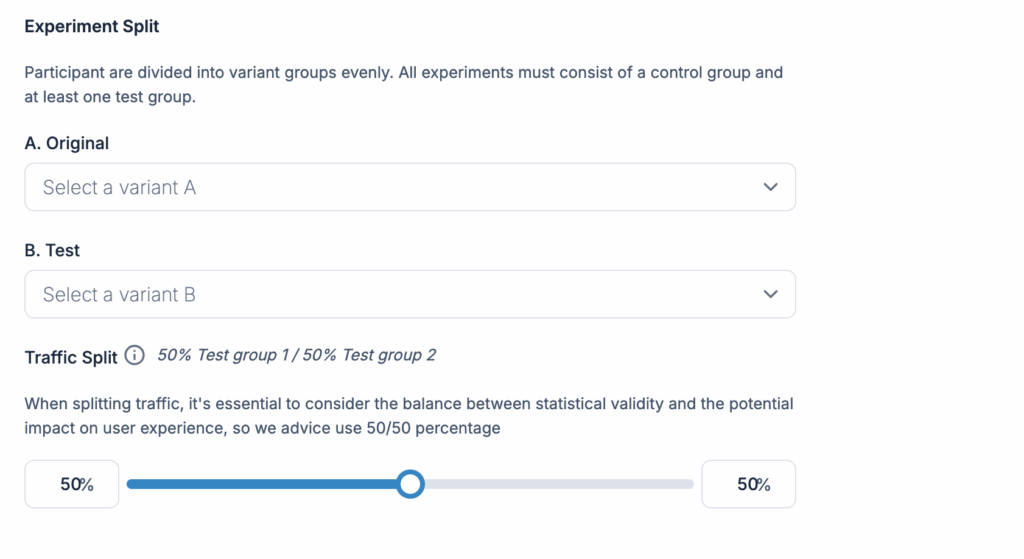 When splitting traffic, it’s essential to consider the balance between statistical validity and the potential impact on user experience, so we advice use 50/50 percentage